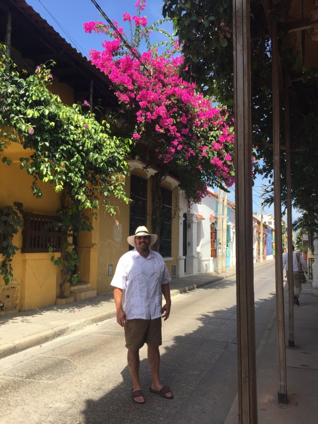 Otherwise though, we had a good day. This morning, we walked along the beach down to the old, historic, colonial part of the city. It was scorching hot, but the beach, which is gray, volcanic sand, sparkles. It’s very pretty. Bill thinks that an erosion of oyster shells created natural glitter. The old part of the city is very pretty. We found our school and some neat restaurants and Bill bought a “Juan Valdez”- style Colombian hat. It’s in the pictures below. We walked along the wall that fortified the old city. We were melting by the time we finished, so we got a taxi home! We bought roasted chicken form the grocery store for lunch and some delicious mangos. This afternoon, we swam in the ocean. Bill doesn’t think he’s ever been swimming in an ocean, and he had fun body surfing on the waves. We aren’t in a touristy part of the city at all and there aren’t many English speakers here in general. There were lots of Colombian families on the beach with adorable little kids. We think it’s mostly people who live in the neighborhood and walk over to the beach. There are probably some Colombian tourists as well. It’s much nicer that way than being surrounded by drunk tourists.