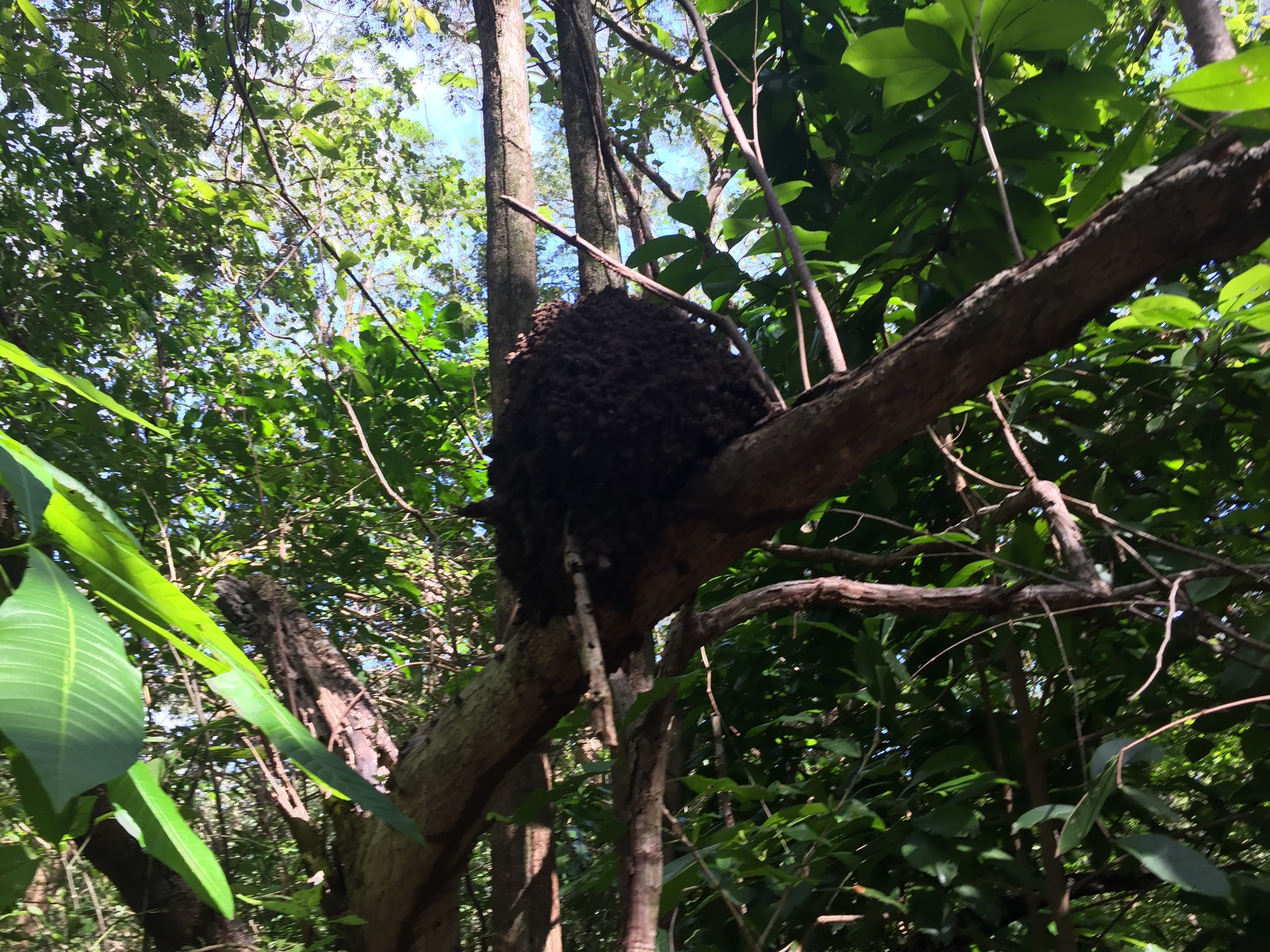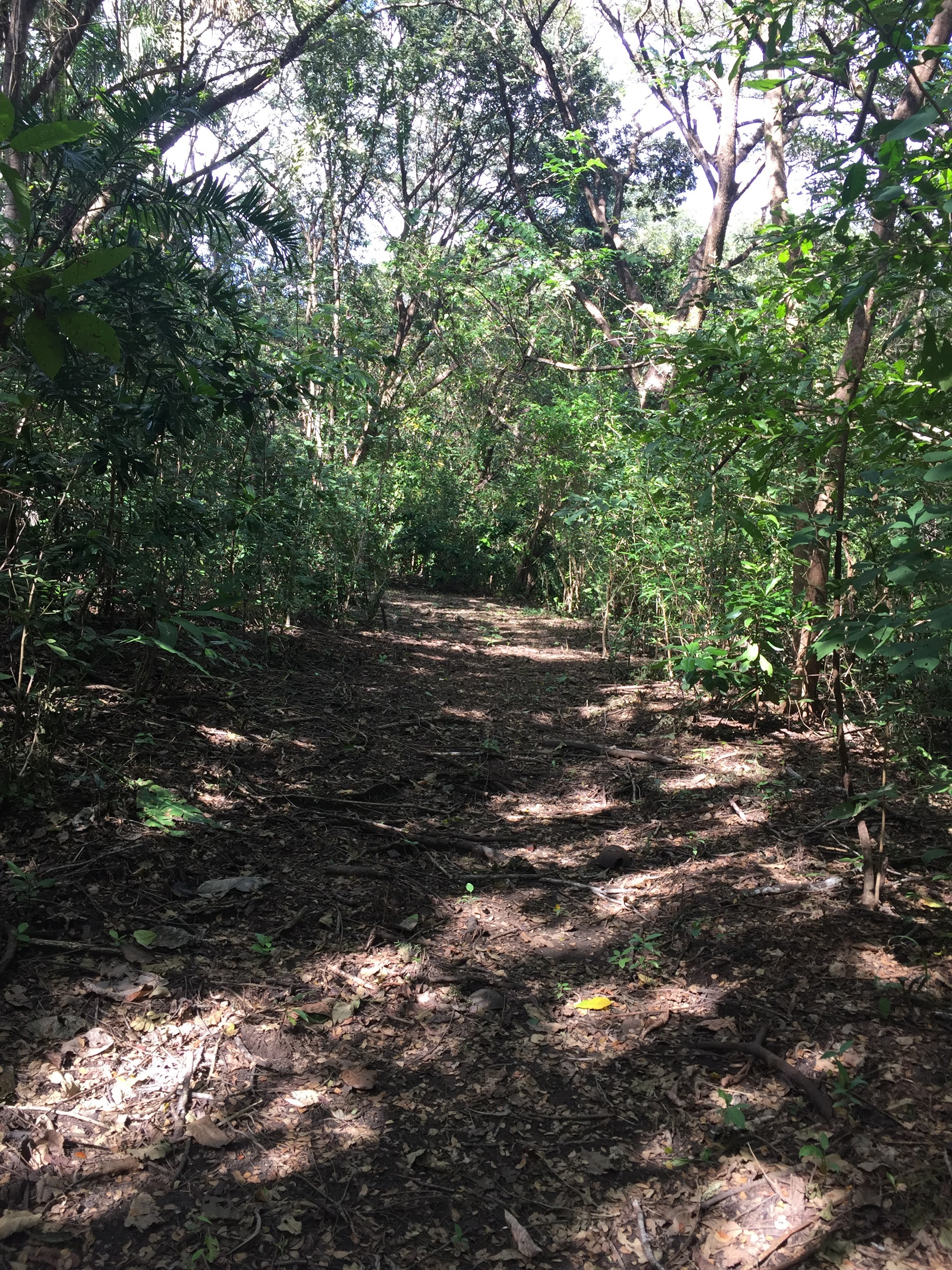When I got up this morning, I had no plans and I wasn’t sure that I’d have anything to post tonight. I had one picture of an iguana on my animal cam, which was not interesting at all. The raccoons didn’t even come back last night! Since I haven’t gotten any good pictures, I decided to try exploring the woods behind my apartment. I found some plastic chairs in the yard, I tossed one of them over the concrete wall behind the apartment and climbed over. The woods looked pretty thick, but once I got in, I found some trails and clear spots. By accident, I came across a trail that someone has cleared relatively recently to get big equipment into the woods. I think the property is for sale and it looks like someone is planning to build something. It’s fantastic for me because there is this really nice trail that goes up to the top of a hill with a beautiful view of the ocean. From there, I was able to climb some other hills and do a bit of exploring. I’m not sure whether the area is currently being cleared or had been cleared in the past and is just starting to grow back. It’s a really neat way to get safely into the woods, as long as I don’t get caught by whoever owns it. I set my animal cam up back there and I’m hoping to get some better pictures. There were animal tracks in the mud. I also want to explore the trails early one morning. I’m more likely to see animals then. I saw some howler monkeys this afternoon but they were high up in trees above town. I’ll have a better chance of seeing them in the woods in the morning.