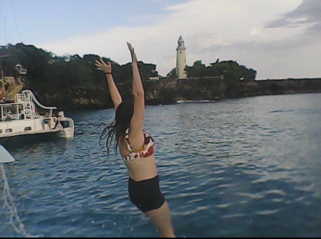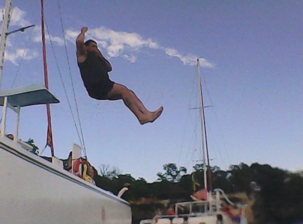 This afternoon, we went on a catamaran cruise. We’ve taken out small ones on our own, but this was a big one for a large group of people. When we started, it was raining and dreary and I was concerned that it would be a long three hours, but it turned out to be really fun. We swam into a cave, which was okay. Bill and I made the fortunate decision to go back to the boat to take advantage of the slide before everyone else got back. Boat slides are a lot of fun! We got to slide several times before the rest of the group made it back. Most other people only got to go once. The water was deep enough to dive off the back of the boat and that was fun too.