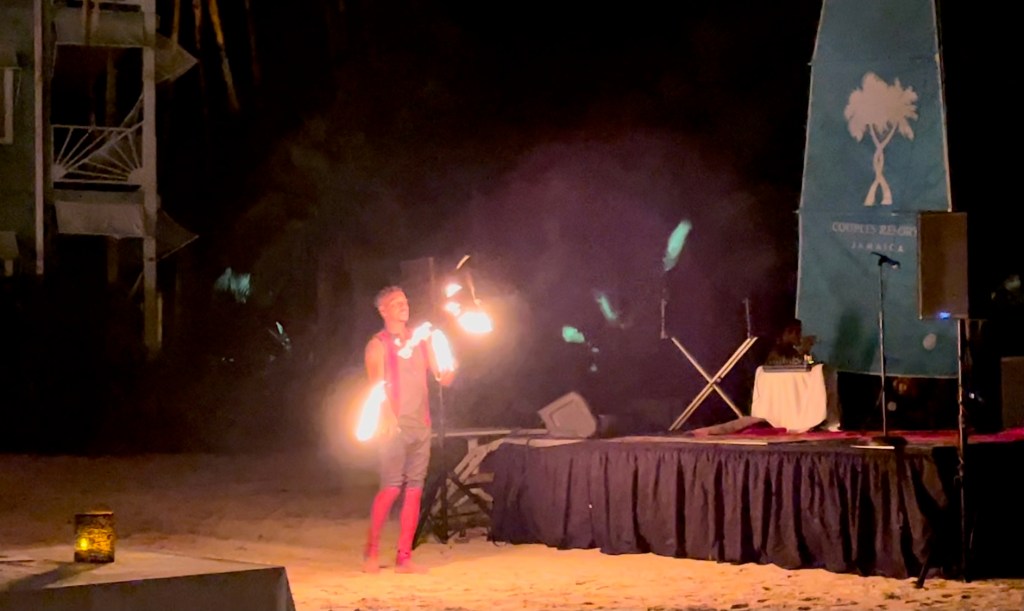 The hotel did a beach party for dinner tonight. Essentially they took the main dining option and moved it outside on the beach. It was a really nice evening for it. There was a nice breeze and it hadn’t rained.
