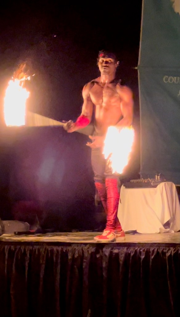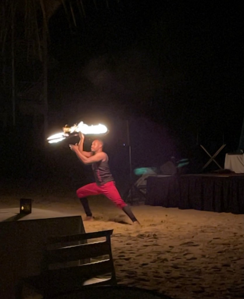 I have very little to report today and it looks like Bill did a long post, so I’m going to do a combination post again today. Bill went diving this morning. I had planned to go snorkeling but the weather wasn’t great for that. It was windy and choppy this morning and it looked like rain all afternoon. It never actually rained, so I could have gone, but since I have to swim or paddle board to my snorkel location, I decided not to chance it. Hopefully I can go tomorrow. I spent the morning in a hammock listening to a podcast, then we took out a catamaran for a little while. We swam in the pool this afternoon. Dinner was on the beach tonight then a fire show that was neat. Bill got good pictures of that. There was supposed to be a dance party after the fire show but no one showed up, which was disappointing.