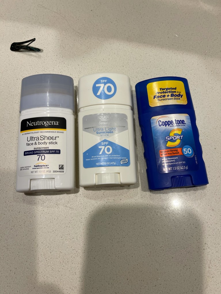 We tried a new Coppertone Sport sunscreen, it works okay and stays on in the water well, I am not a fan. It is very greasy and worse when you are in the water. I like the Equate brand that is a knock off of the Neutrogena ultra sheer. It has kept us from getting bad sunburns. It’s nice because it is a stick so easy to put on and it doesn’t need to be put with your liquids. Sunscreen can be very expensive in sunny locations, it’s better to bring it with you.