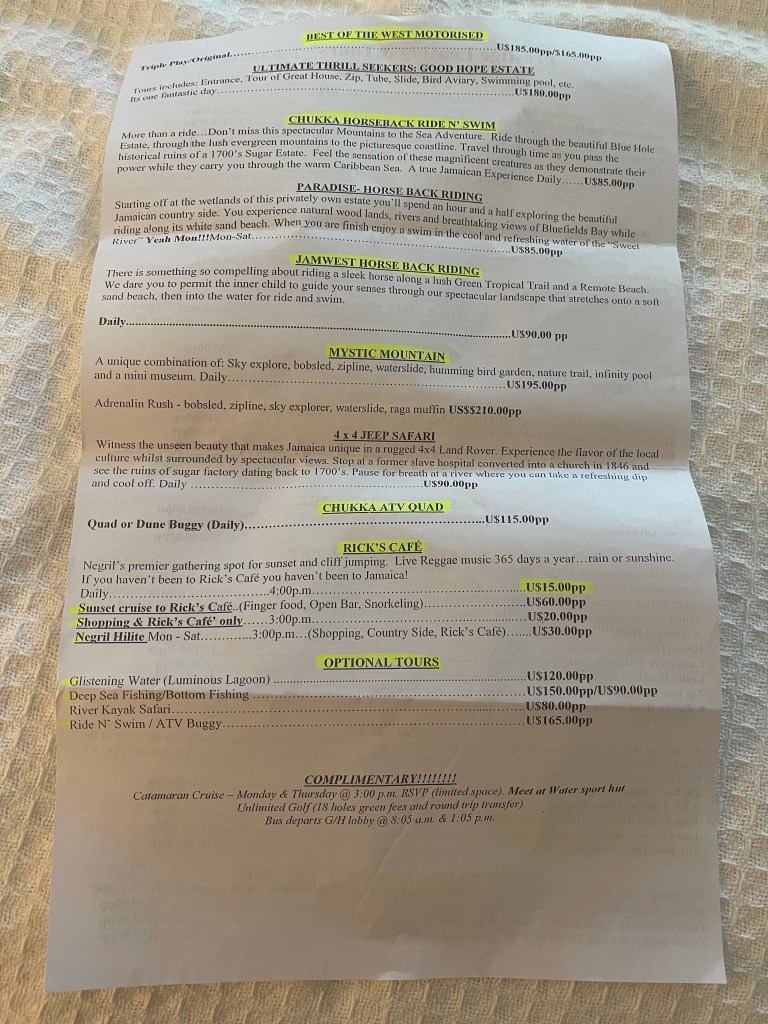 We both tested negative for covid so we didn’t get contaminated while here, hopefully it stays that way. We have a direct flight back to St. Louis tomorrow, I’m curious as to how many people are in Jamaica going on our flight. We have seen a few people from Iowa here and a lot from the south.