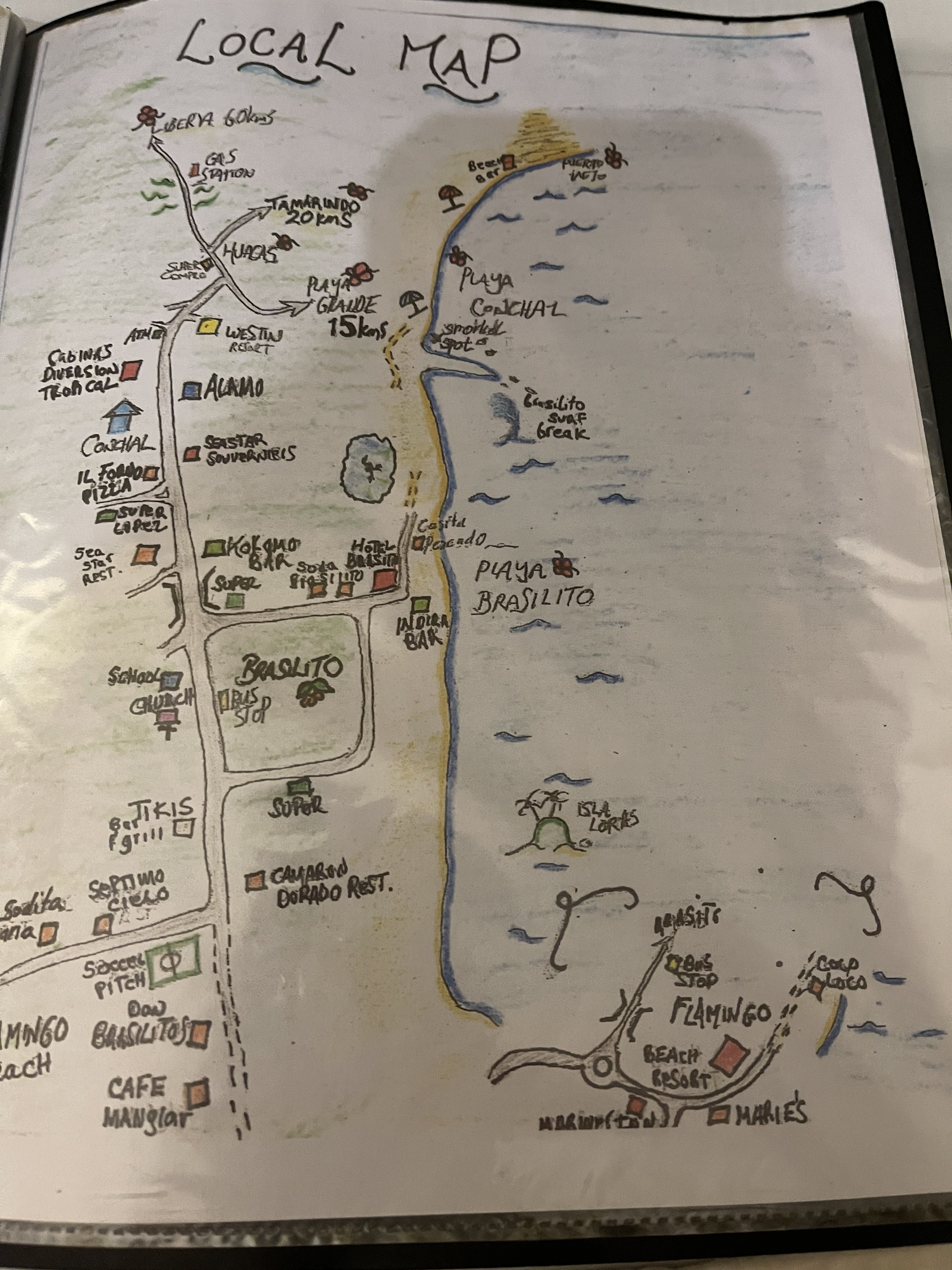 The beach is large! Plenty of room for everyone. We did have to cross the bridge that our hotel is 200 meters south of. The bridge is a one lane steel construction bridge that is not special except for the fact it seems to be the only one and there is a fair amount of traffic that uses it along with people. There are a handful of shops/tiendas and small restaurants/sodas. There are a few regular restaurants/restaurante. I’m looking forward to trying the sodas, they are supposed to be more local type places, the food is supposed to be good, kind of like when on the road stopping at truck stops because the food is supposed to be good. I think there should be plenty of places to try here and if we need anything we should be able to find it. There is a little bigger town about 8 kilometers north of here we may have to check out if we run out of things to do, though we may end up there during our excursions anyway. We have started planning what we would like to do as far as those go. I already have four days of scuba lined up that I’m looking forward to. I’m going to do two tank dives, which is just two dives, one after the other and they move locations. I hope to see 8 different places. Emily is lined up to come with me to snorkel for three of them. We are going to snorkel tomorrow with Kevin’s Tours in the morning.