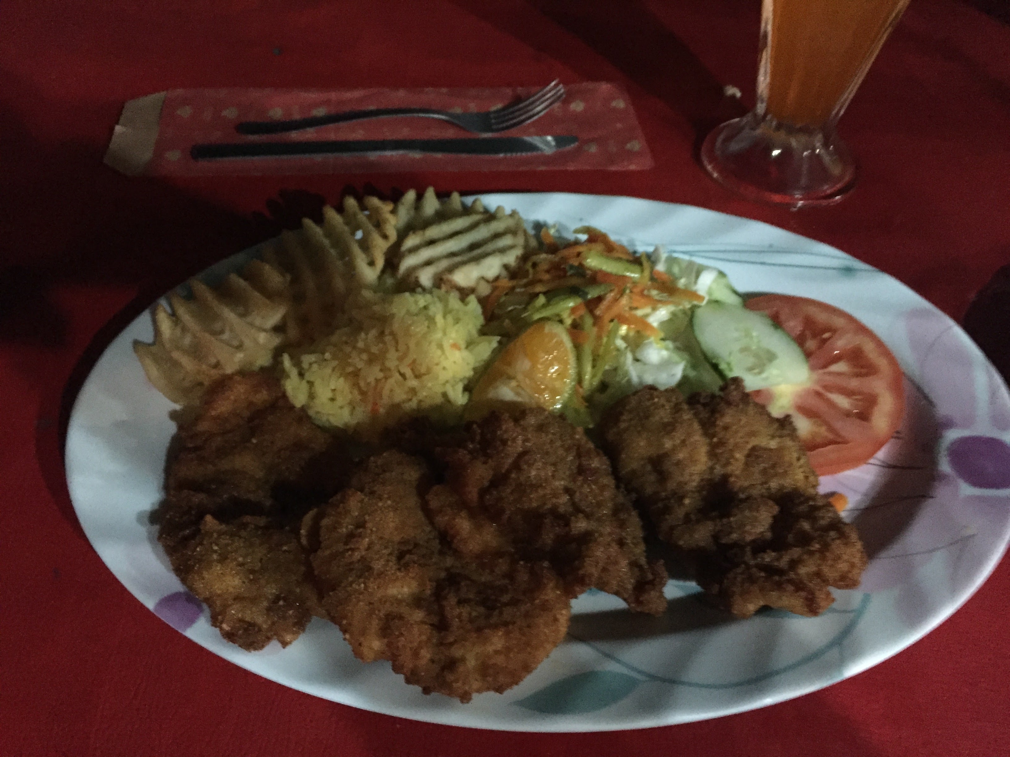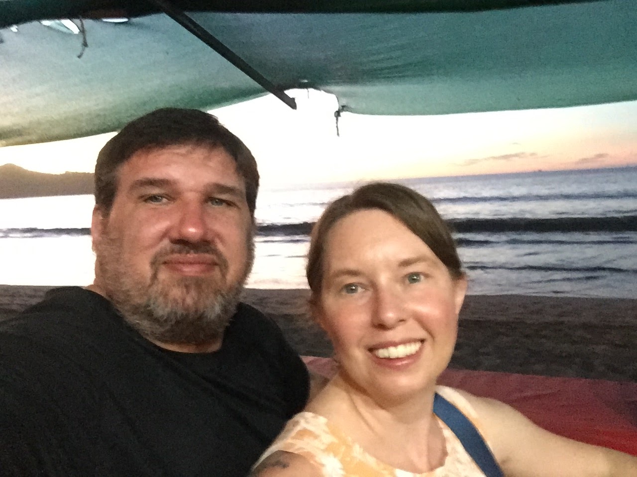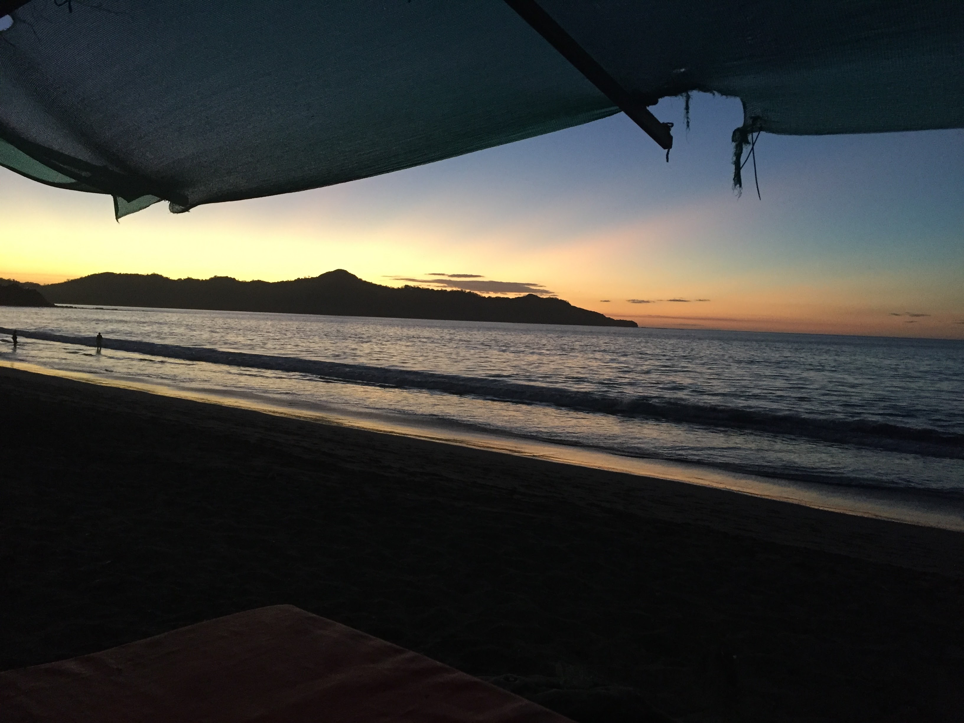 For dinner tonight we went down by the beach to a Sketchy looking place which is right down by where we met Sketchy Kevin. The food was good. The restaurant is on one side of a dirt road and the main dining area is on the beach. We sat looking out at the end of daylight, the sun had already dropped below the horizon by the time we got there. There was a nice outline of the mountainous area out by where we snorkeled this morning.