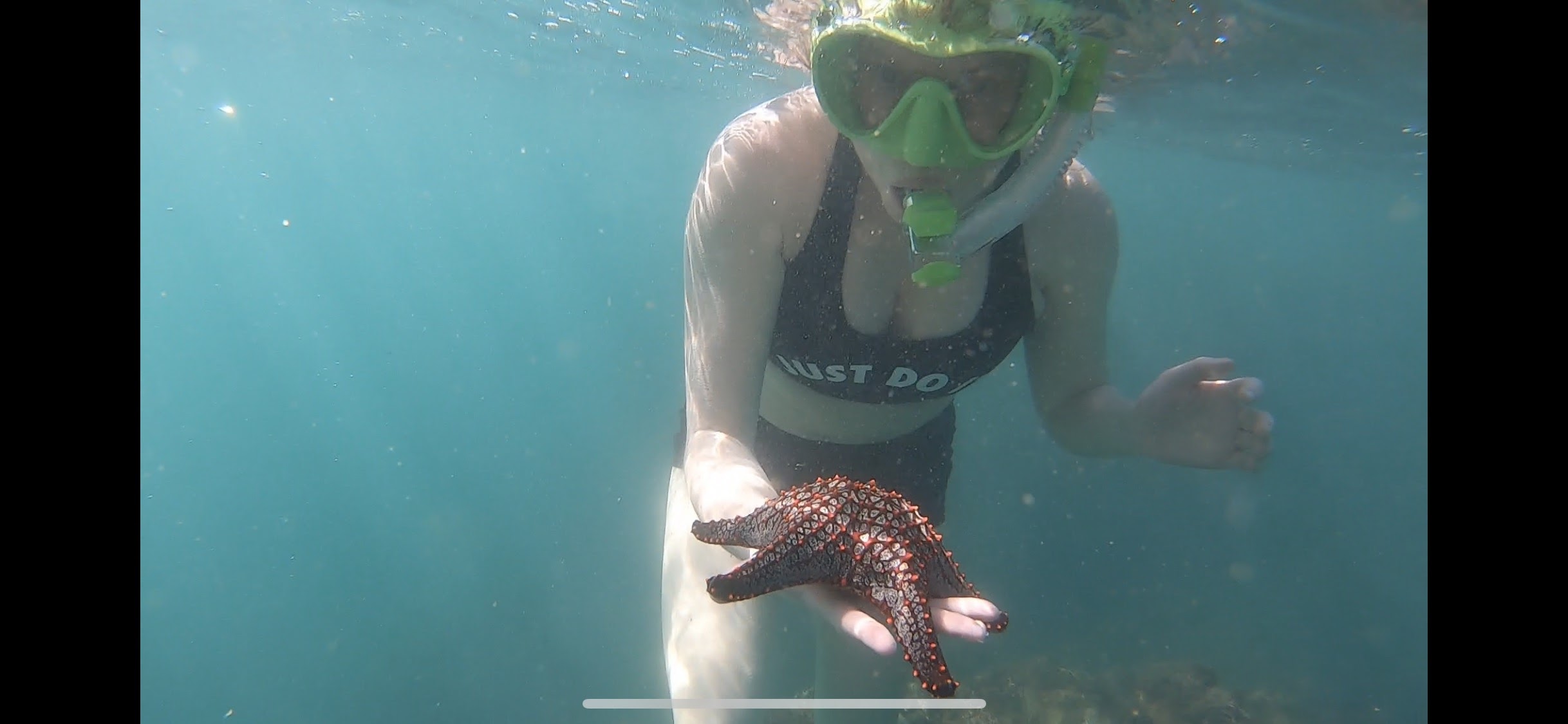 The star fish was brought to me by one of the fishermen, I was swimming along minding my own business and he thrust a starfish at me. I took it to Emily. She said she also seen a bigger one. We did see some puffer fish, the first one Emily showed me.