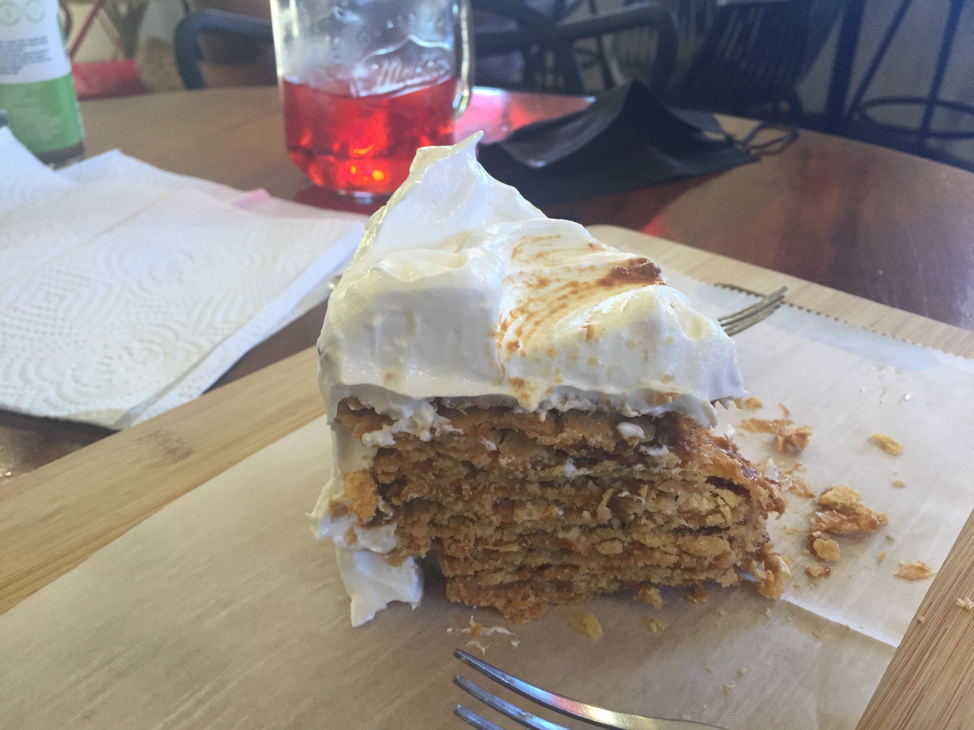 We really don’t have pictures from today but I’ll post Bill’s cake. It was made of layers of flaky, pie-crust like material, caramel, probably almond slivers and topped with a creamy frosting. It was rich!