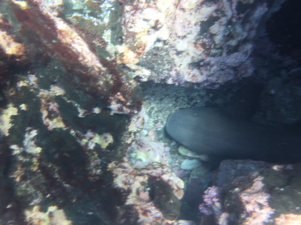 I also saw a small reef shark. They nap on the ocean floor in the daytime and hunt at night. They are non-aggressive sharks and are harmless for humans unless you grab one by the tail or something stupid. My little shark was napping peacefully in a a little cave in the rocks. It didn’t seem super excited that I kept coming over to take pictures, but it didn’t leave either. These were my first sharks and eagle rays. I was hoping to see a turtle, but no luck on that. We did see one a couple of days ago jet skiing.