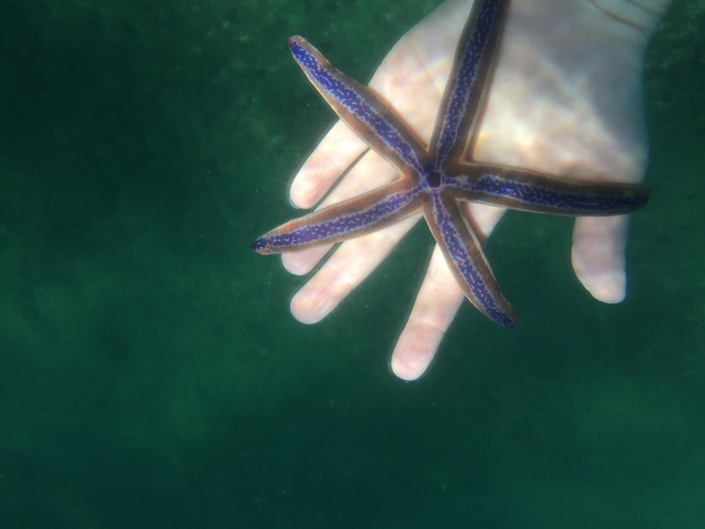There were also a whole variety of multi-colored fish, starfish and invertebrates. It was like being in a huge aquarium. I had some problems with jellyfish again, but I was mostly able to avoid them. The rocks that I was snorkeling around had waves crashing around them and the jellies seem to like calmer water. I didn’t smell as bad when I finished snorkeling today, probably because I stayed away from the jellies.