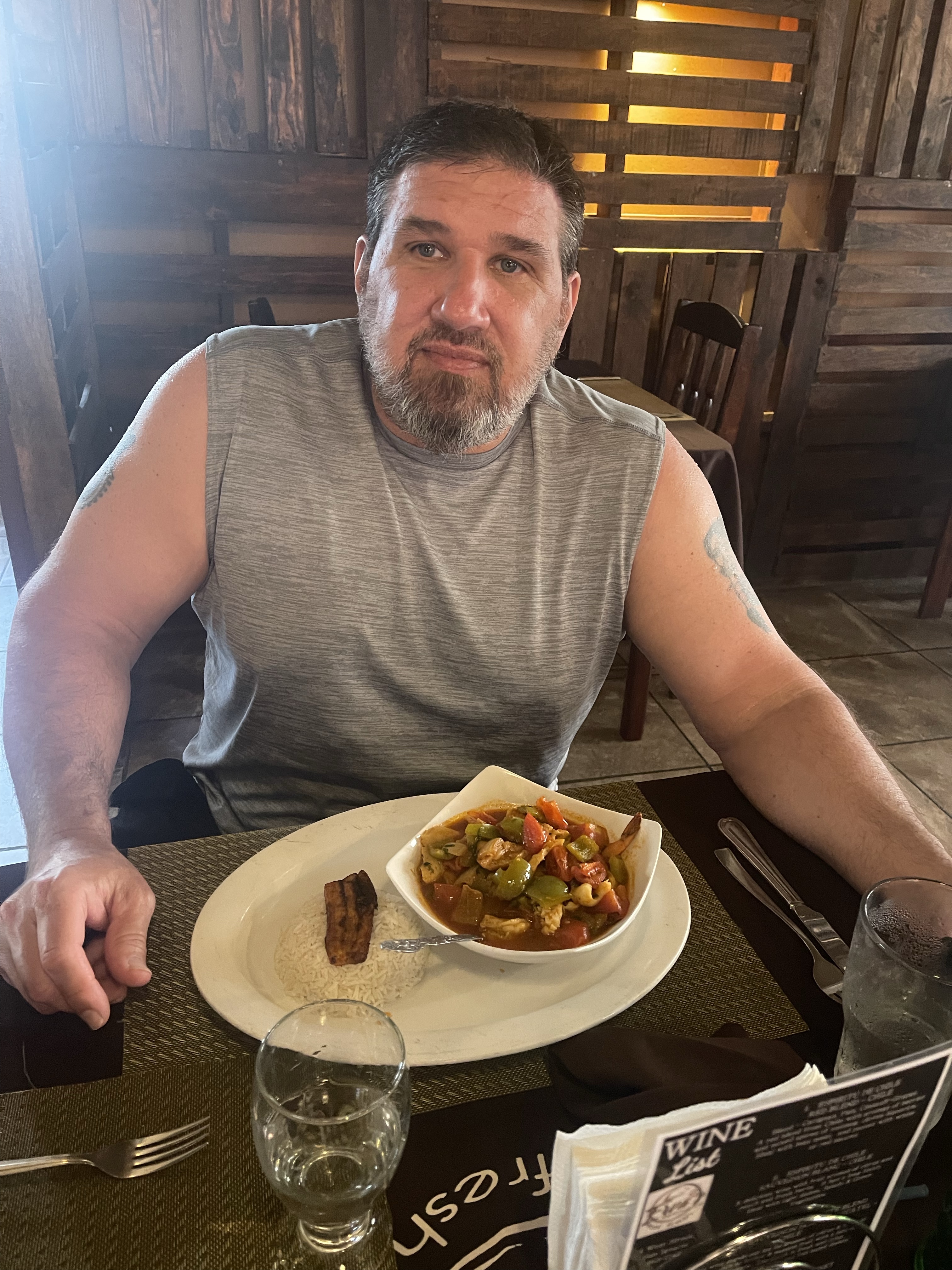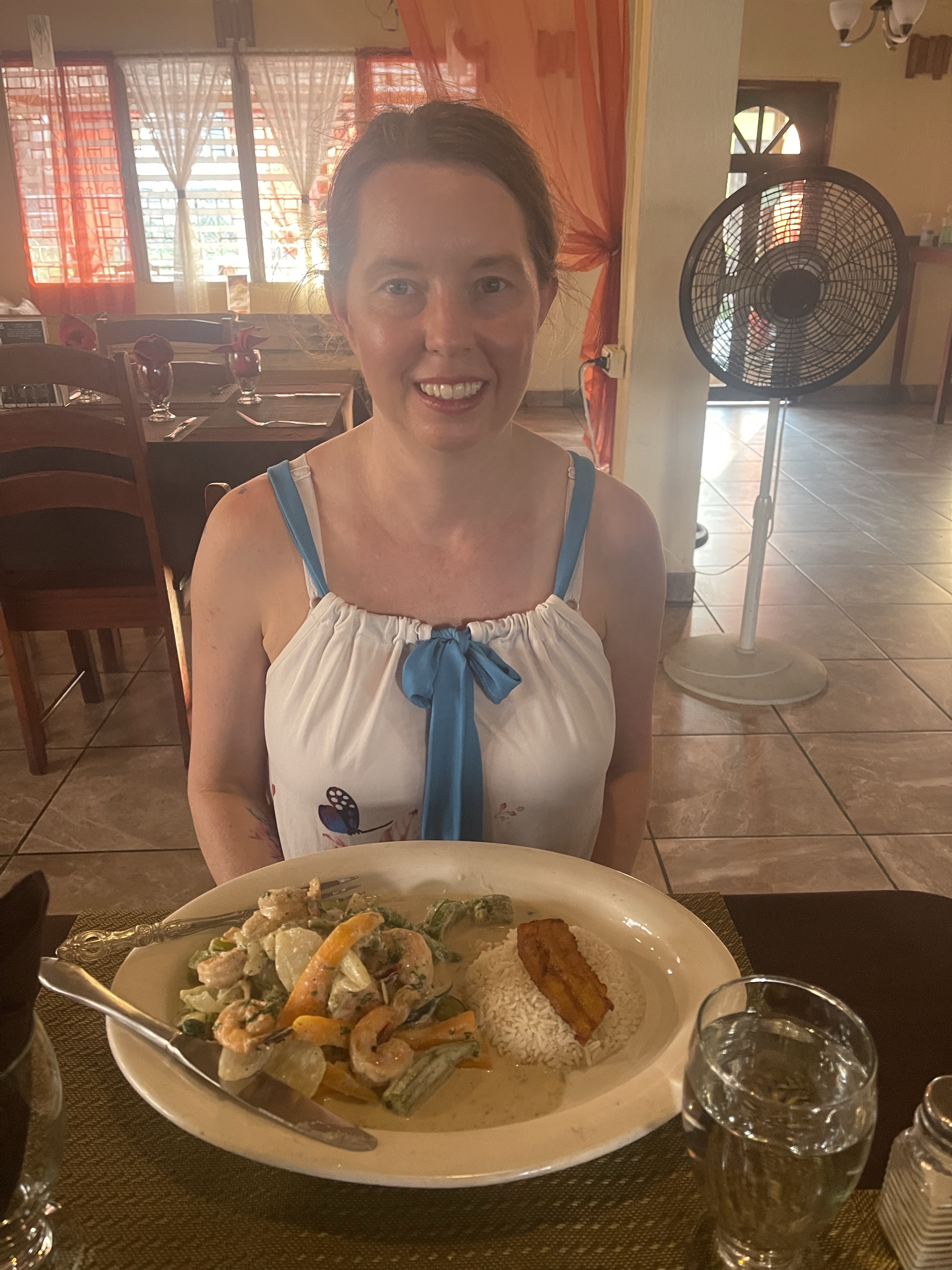 Our afternoon we spent in the pool and lounging. We had talked about going to the chocolate factory and we tried to walk there but the map wasn’t real clear. I had to take screenshots of it because it seems US Cellular is unable to provide me with service here in town with a tower next to the hotel, they were however able to whilst we were a mile from Guatemala at Xunantunich. Somehow I misses a street and we ended up downtown. It worked out okay as I decided I was really hungry and early supper was a good thing. We got sent to a restaurant a couple blocks off the main drag by a tour place guy who was trying to get us to do some tours. Erva’s on 4th st. It was a very nice place. They had open air and A/C seating. We both ate food common in Belize, I had a creole dish with seafood and Emily had a coconut shrimp dish. Very pleased with the food, it was recommended by who I assume was the owner and chef.