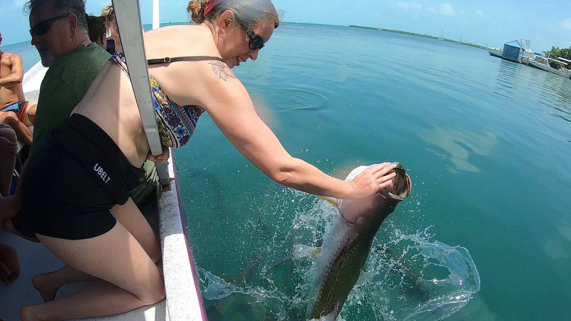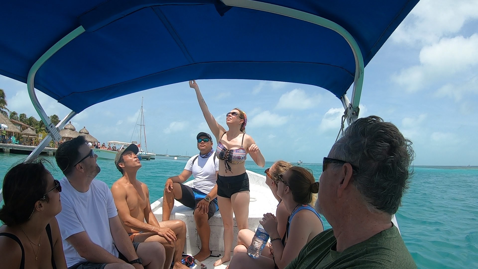 We finally had a bright, sunny day and reasonably good weather for snorkeling! It took a while for everyone to get snorkel gear and fins at Caveman Snorkel Tours so we left in boats a little before 11am. On the way out out, they gave us some fish and let us hand feed some frigate birds. If you hold a fish up in the air, the birds will swoop down and take it from you. They are excellent thieves. They don’t swim but they regularly steal food from birds that dive and bring food up to the surface. We also got to feed some terrapin fish. They jump out of the water and take fish out of your hand.