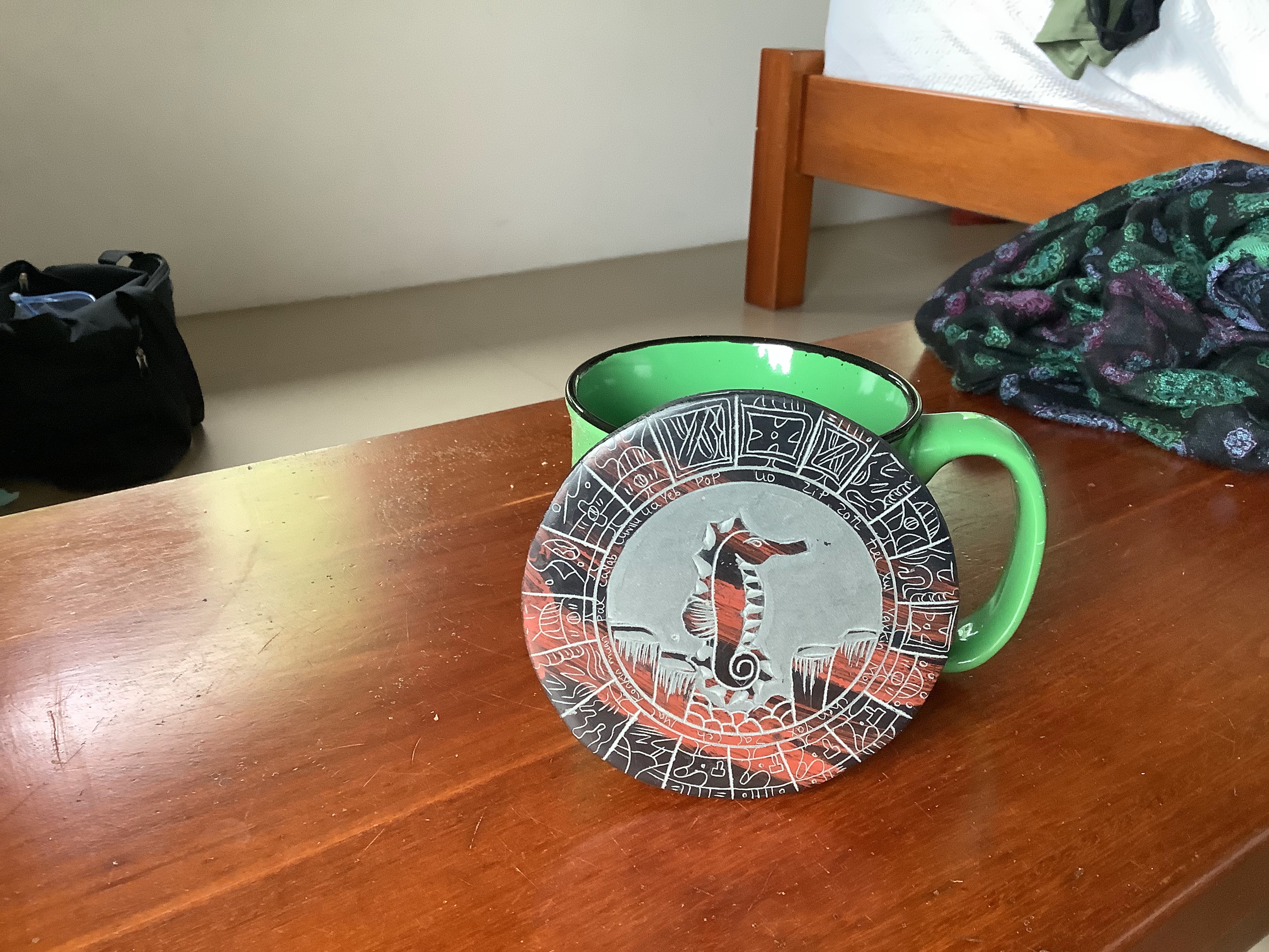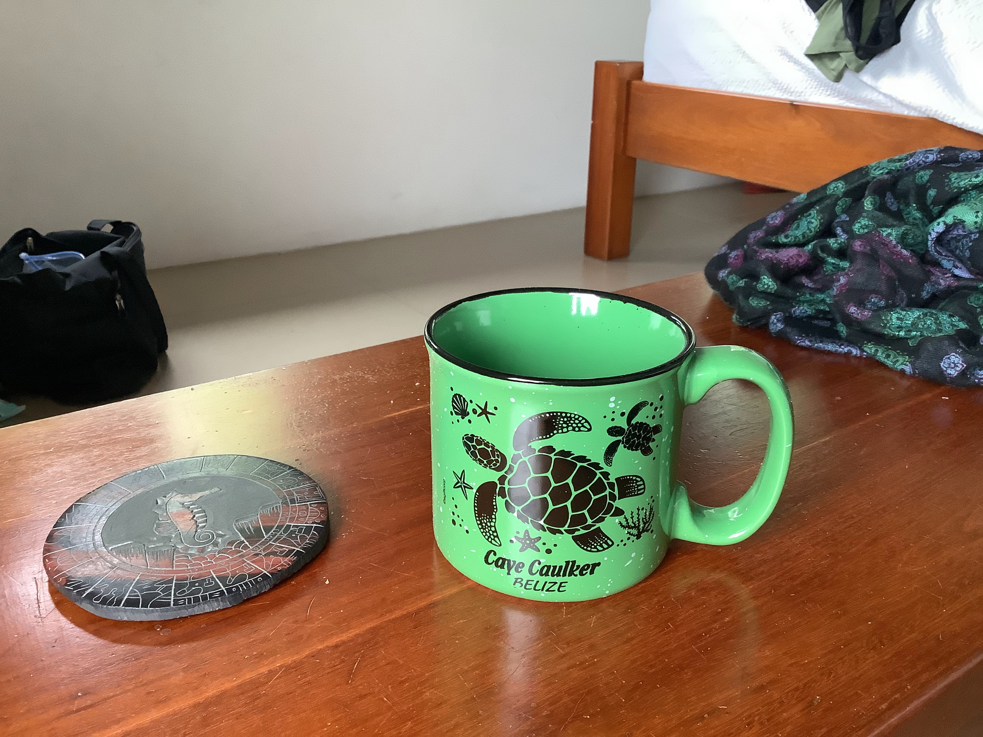 After I finished watching seahorses, I did a bit of tourist shopping. I try to get a coffee cup from all the places I visit so I got a cup and a coaster. I didn’t love my cup options but the one I bought is fine and it’s a size and shape I like. At least it’s practical. The coaster is super neat. It’s etched slate and has a seahorse in the middle and I think symbols of the Mayan calendar around the edges.