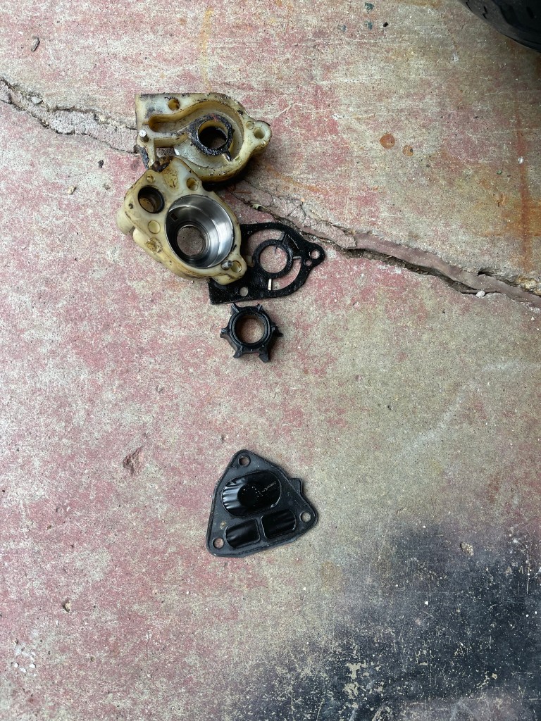 I probably should have started with making sure the motor still ran, it did not. But I replaced the starter and solenoid and we were in business, until no water came out of the drain. So a new water pump became a learning experience for myself and the neighbor Jeff who was interested in what I was up to when I dropped the lower end off the motor. He just recently bought himself a boat. He ended up helping me for about 3 hours and his help was very welcome.