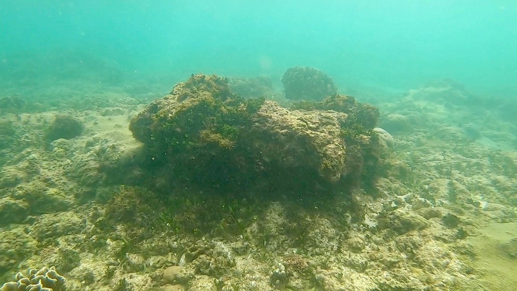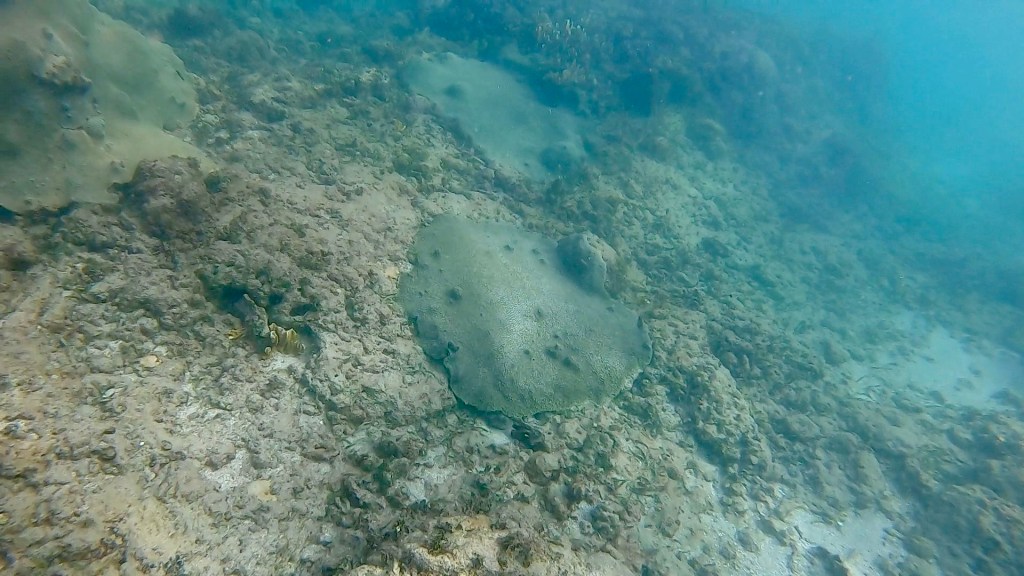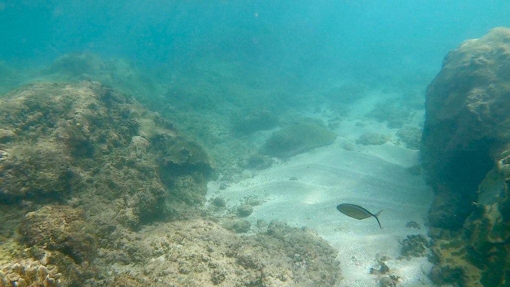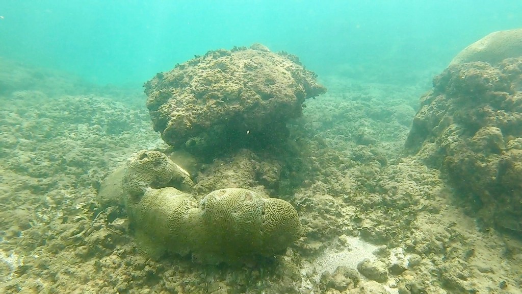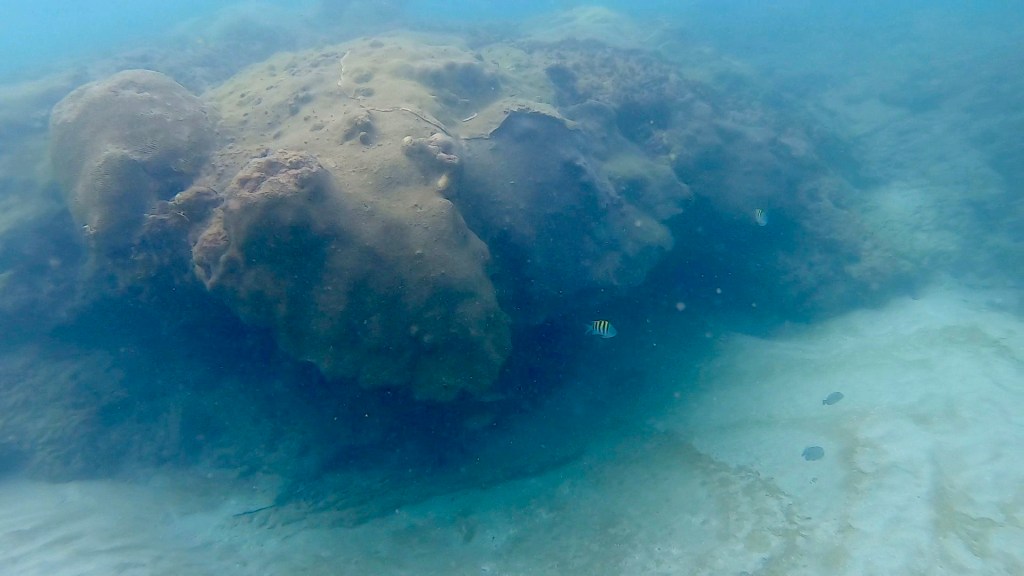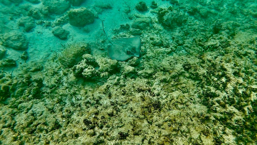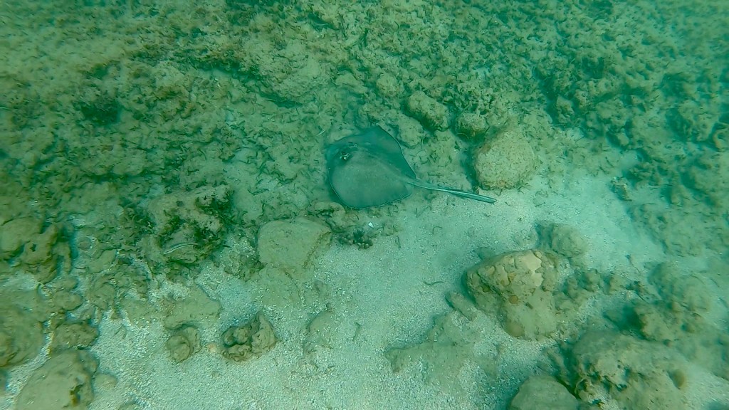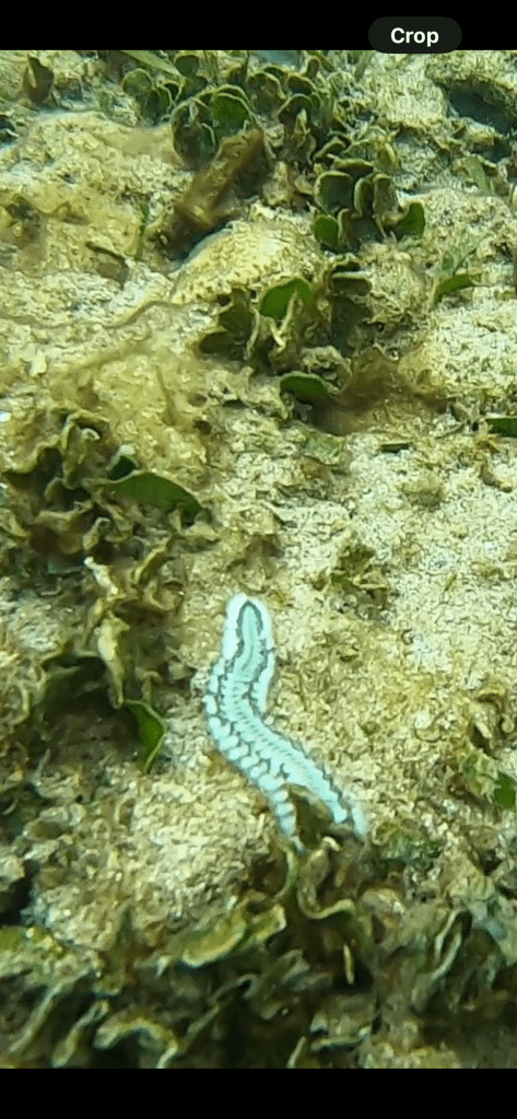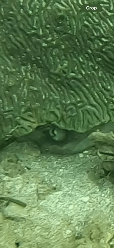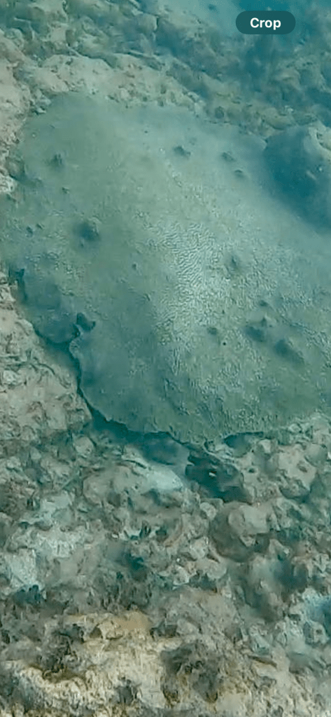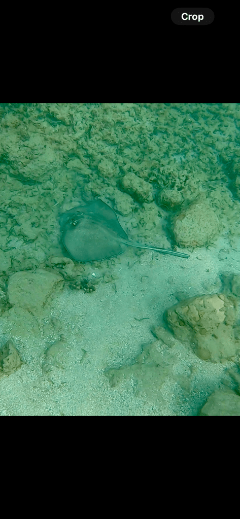 Emily spotted an octopus and a ray, we watched the octopus for a while hoping it would come out for a visit. It did not, occasionally it would show it’s tentacles and reach out to feed the edge of the coral it was under. We spent a fair amount of time in the water. There was a guy looking for lobsters, he had one in a bag.