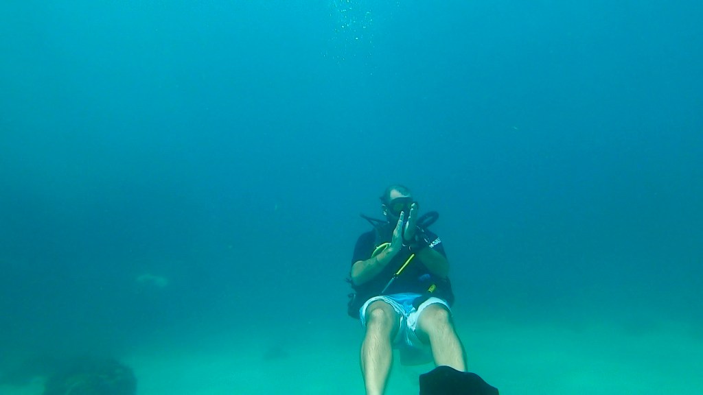 My dive buddy today was Cedric, he is here from France with his family. Emily got to speak with him in French at lunch after the dive. Cedric hadn’t dove for ten years and he had stopped in and asked about diving this morning and since I chose to do a refresher Francisco asked if it was okay, which I think didn’t matter since he already said he could. It was good with me though, I told Cedric that I hadn’t been getting a lot of down time and I was around fifteen dives so I still needed to work on breathing and buoyancy control. He was good with that since it had been so long since he dove. It also turned out that Cedric was not certified yet as a diver either. He told Francisco after the dive he hadn’t taken his PADI test yet, I seem Francisco’s face kind of curl up like what??? After I said that Cedric probably should have done the Discover Scuba class, it’s like the refresher but a little longer. In the end though Cedric did fine on the skills and we had no problems. I wonder if he had been certified through a different dive organization besides PADI.