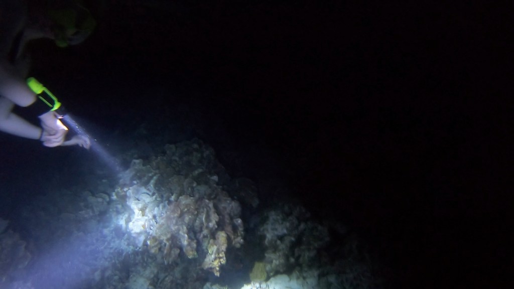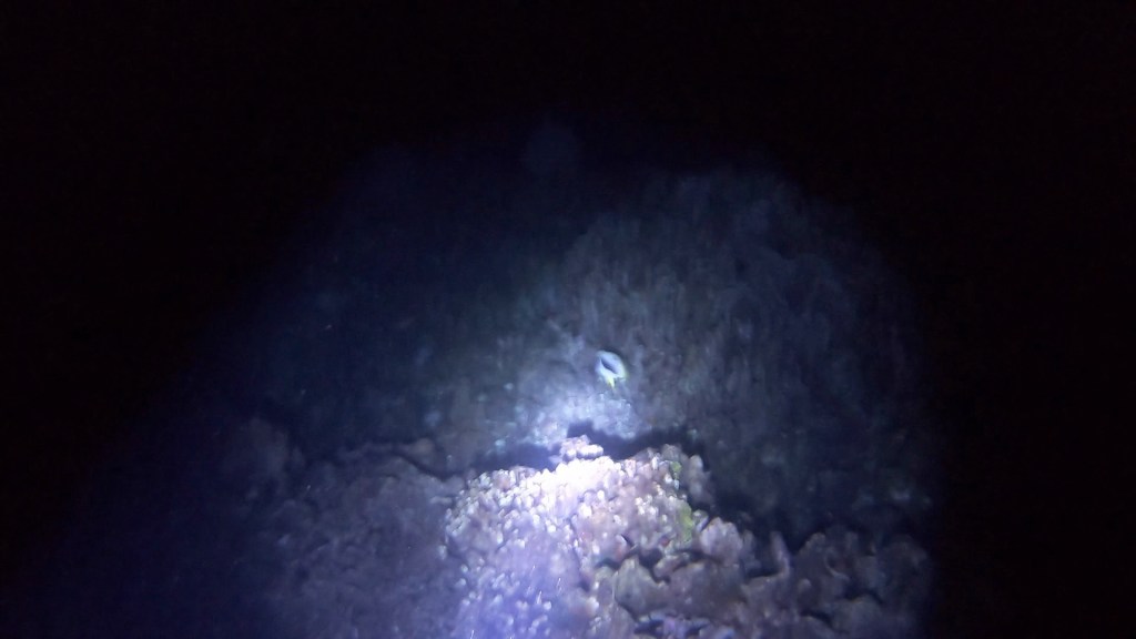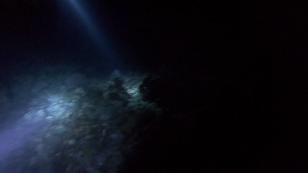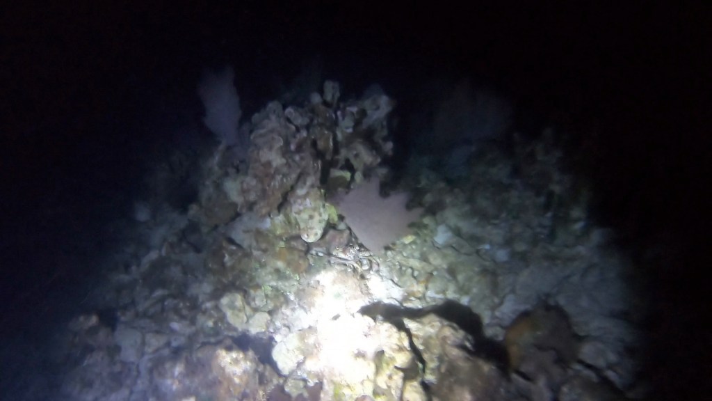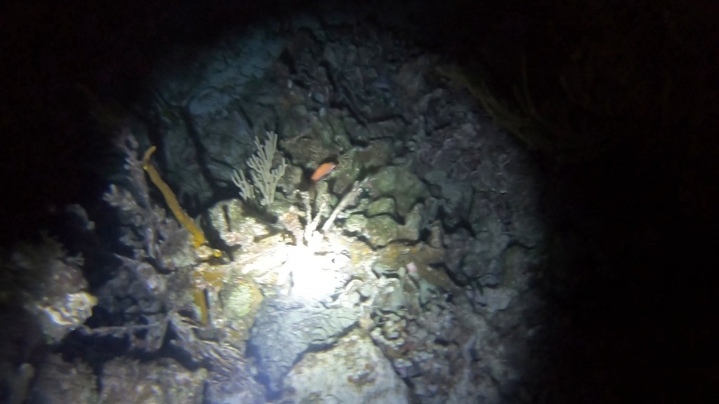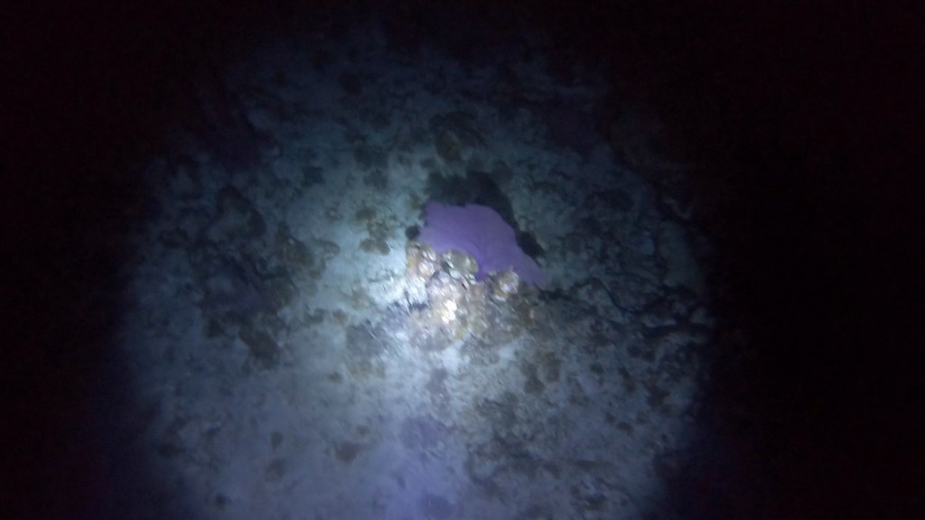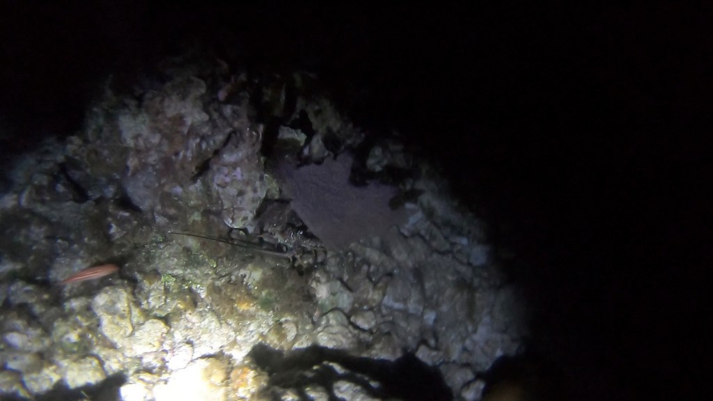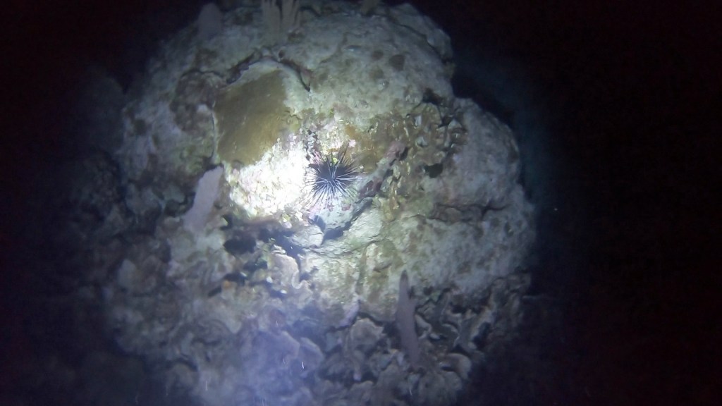 We probably got a half hour or so in the water before my incident and I had gotten some pictures. Unlike other places the night life in the water wasn’t much different from the day. I did notice the colors were brighter, the blues, greens and purples. A handful of fish, a lobster, several ot the tentacle type starfish and a lot of sea urchins.