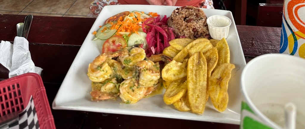 The food here has been really good! Yesterday, I had shrimp in a garlic sauce with rice and beans, a salad, some sort of pickled purple vegetable, and plantain chips. For supper, I had fried shrimp with French fries. They also make really good lemonade here.