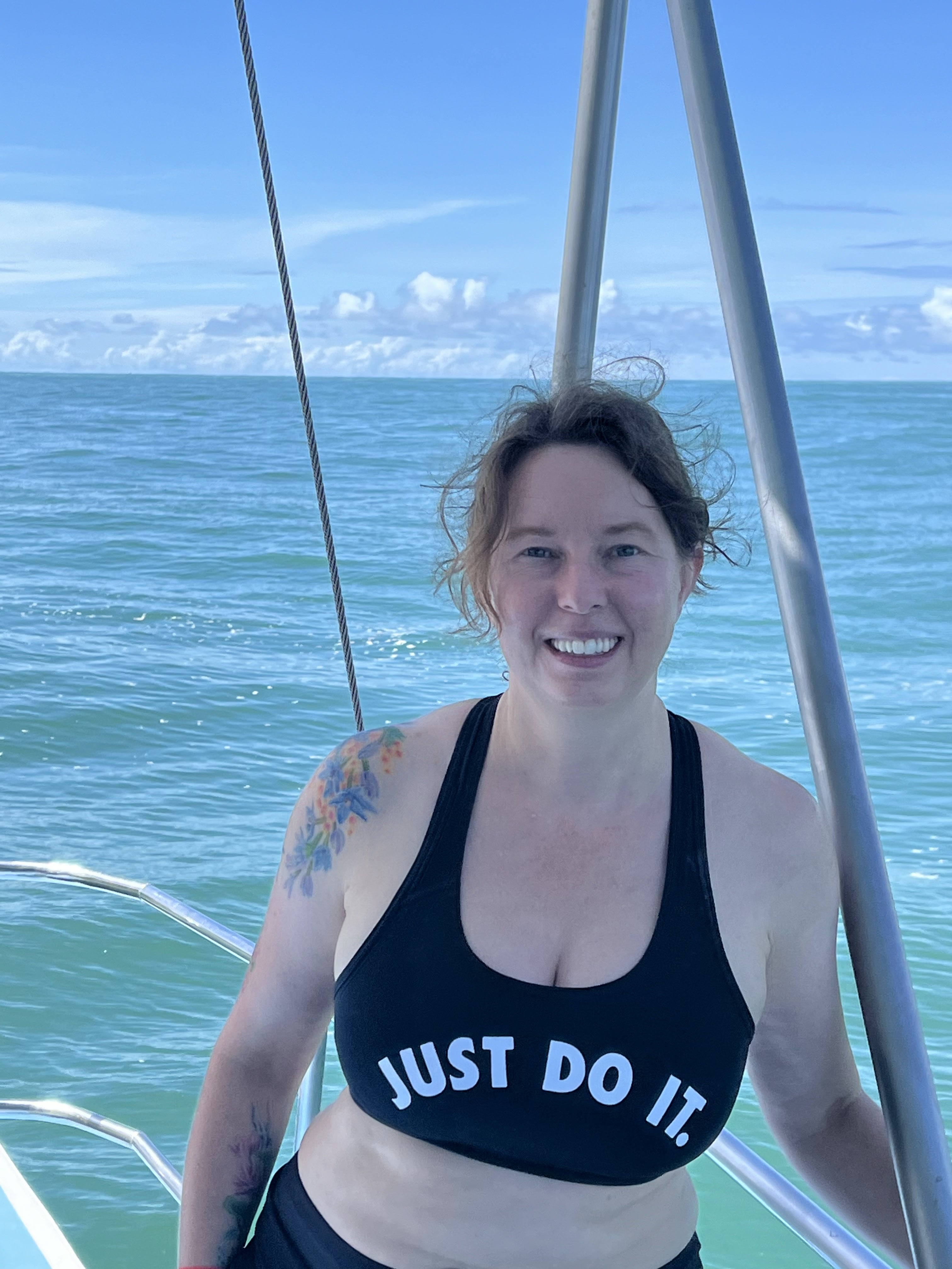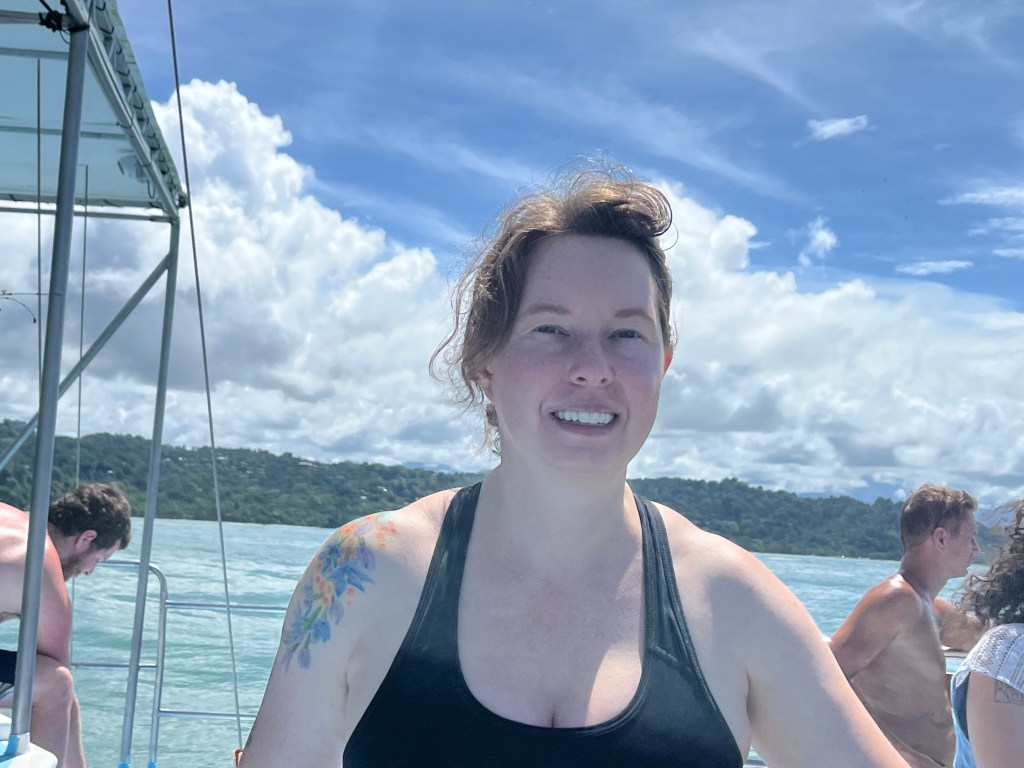 I had a very fun morning whale watching. Unfortunately, I only saw the fin of a whale in the distance. In two weeks, there will be hundreds of humpback whales here, but right now, there are only a few. But, there were a number of super cute spotted dolphins and it was a beautiful day for a catamaran tour. The tour provided a 30 minute snorkeling option, but apparently some guy died a year or so ago so they make everyone wear life vests now. I hate wearing life vests in general and it’s impossible for swimming and snorkeling. I was pretty upset about this at first, until I learned that you didn’t have to wear a vest while using the boat slide. So, while everyone else did some pretty bad snorkeling, I had the boat slide all to myself for about 20 minutes. It was fantastic! I love boat slides. The tour also provided a good lunch with fish, beans, rice and vegetables plus a delicious pineapple.
