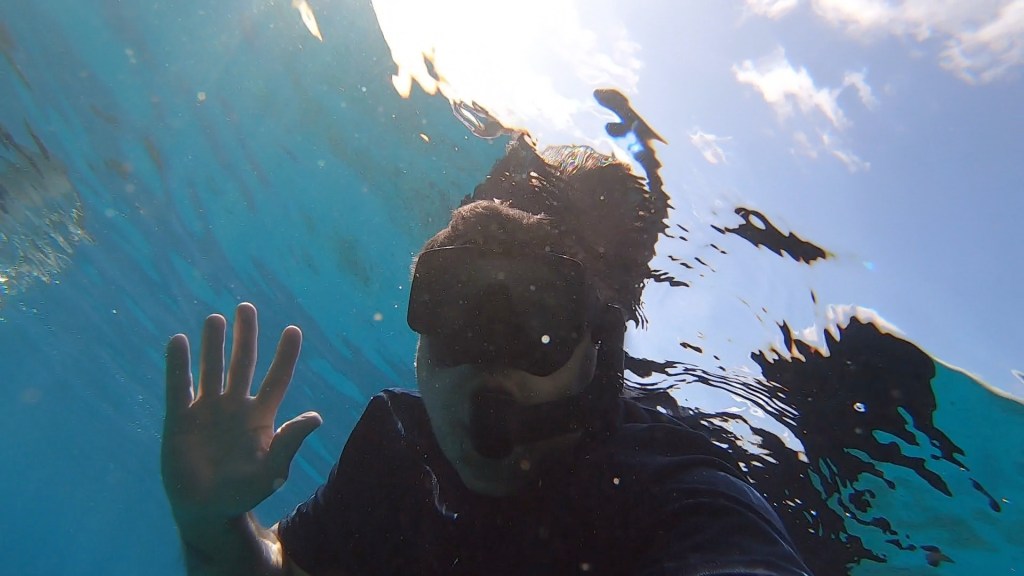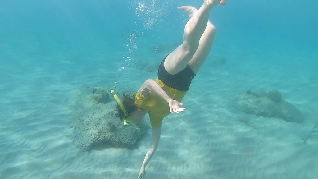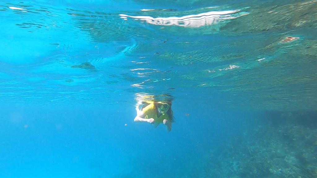 We went snorkeling yesterday afternoon at the beach below our accommodation. It was okay. The beach isn’t too crowded while we have been seeing it and when we were there. The depth drops fast to where you can’t stand in it. It has waves but nothing big, not a surfing or boogie boarding place. I didn’t take my camera with me so no pictures from that beach yet.