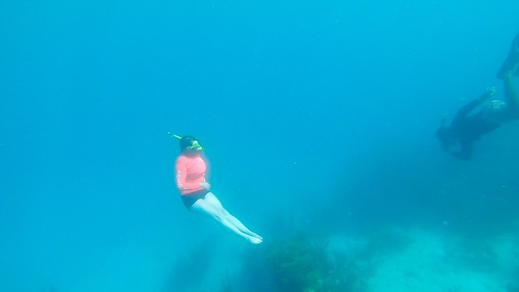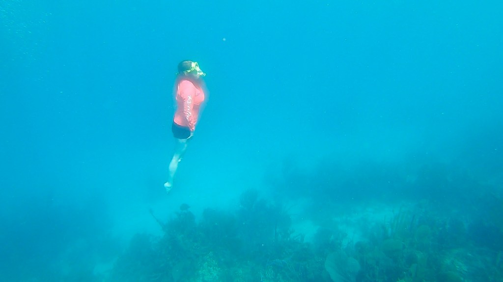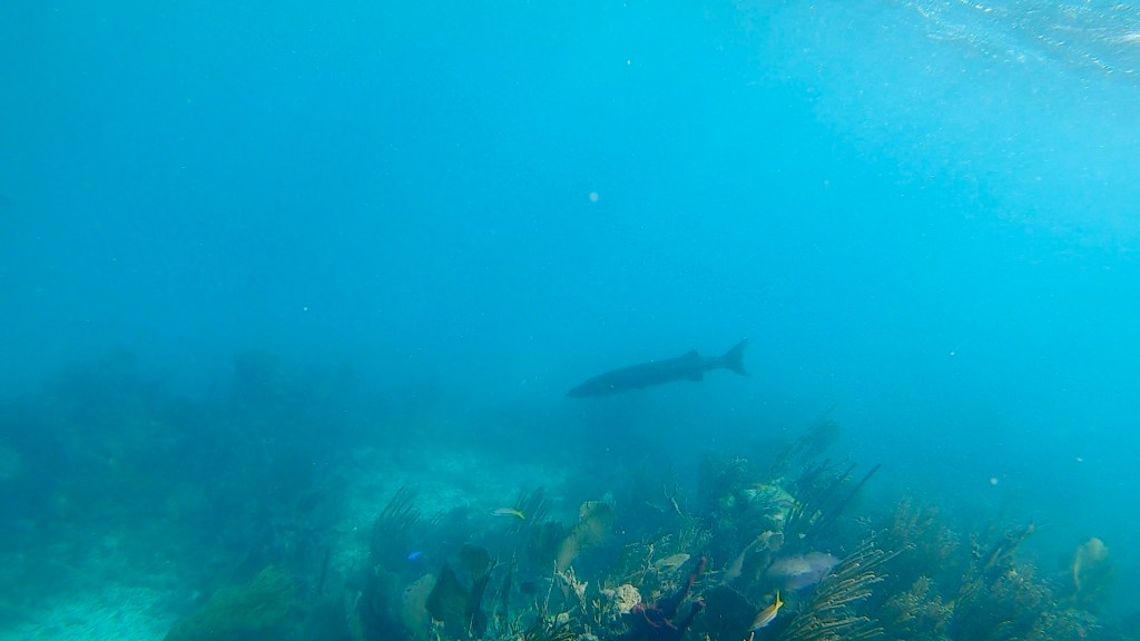 There were a few lobsters and a barracuda, the lobsters were not very easy to see even with some picture enhancement. Mostly I got pictures of Emily swimming. She said that our readers have seen plenty of those already. But here’s a few more.
