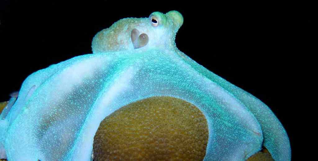 Anyway, it was a spectacular experience. Sometimes a guide is nice because they can find sea creatures that are hard to see, but alone, I can do whatever I want without worrying about following someone else. Initially, I wasn’t seeing much, so I turned my light off and floated in the dark. There are little bioluminescent creatures called sea pearls here that glow in the dark all around you once you turn off your light. It’s magical! When I turned my light back on, a Pacific Reef Octopus was right under me. I startled it with my light and it flared out luminescent sea foam blue-green, then shifted between brown and white and bright blue. I reached my hand down and it sucked onto my finger with one of its arms. Picture below: