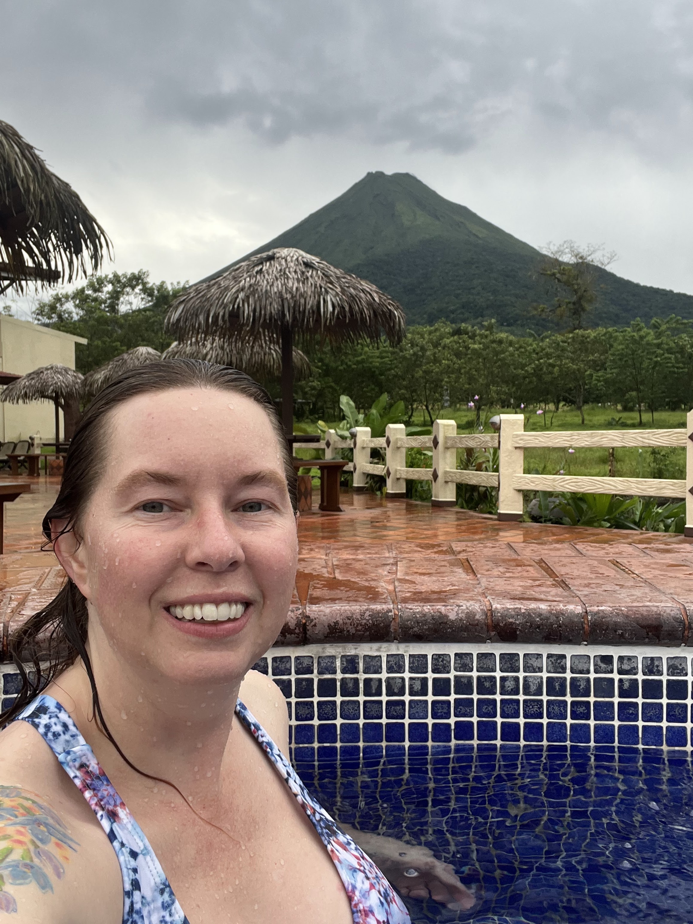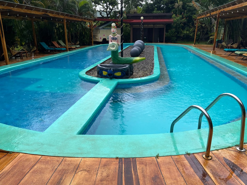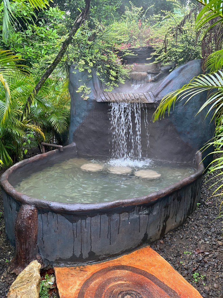 I’m currently at one of the most beautiful places I’ve ever stayed! The hotel in La Fortuna was fine, but I found one with excellent reviews for $95 a night in the middle of the rain forest. It’s spectacular! My room is beautiful! It’s like someone dropped this place in the middle of the rain forest without damaging much of the surroundings. There is a nice pool, but the hot springs are amazing! There are a series of small pools, surrounded by plants where thermal water is pumped in. It’s raining and cool, so really good weather for hot springs. A little less rain would be nice. There is also a river with pools where you can swim. I’ll walk down to that tomorrow if there is a break in the weather. It’s a 90 degree slop down to the river and it will be a rough walk back up too.