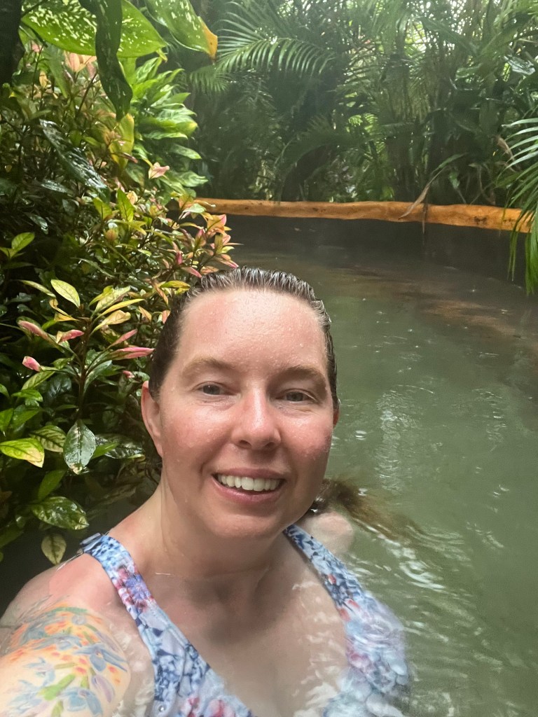 After lunch, I went hiking on the trail around the hotel. It’s not long but it is steep! It’s very pretty. There is a small river behind the hotel so the trail goes along that, then up a steep hill. They have added some concrete barriers in the stream to make small pools that you can swim in. They advertise it as crystal clear water, and it probably is at certain times of the year. Right now, all the rain is washing mud into it, so it was a little murky. I swam in the pool after my hike/river swim, then went to the hot springs.